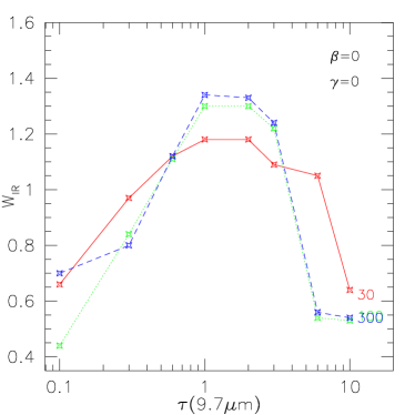 There are a few considerations to be made on the interpretation of the trend in Fig. 7. The maximum of emission for low values of optical depth falls right on top of the silicate feature which in these cases can display a very intense emission. This will in turn give a low value for the bump width as defined by Pier & Krolik (1992). Furthermore, very high values of optical depth will cause the silicate feature to appear in strong absorption especially at equatorial optical depth higher than , resulting, again, in a low width for the IR bump.