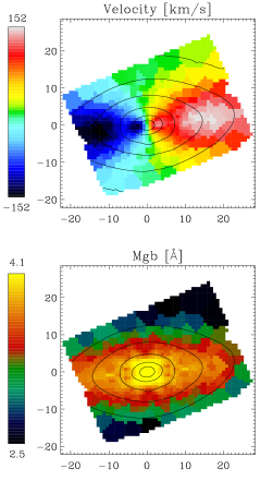 The Mg index is the most stringent feature in our survey and potential differences between isoindex contours and isophotes should be most apparent. Indeed we find a number of galaxies in our survey where the isoindex contours clearly do not follow the isophotes, e.g., NGC 4570 and NGC 4660 (see Fig. 1). Both galaxies show fast-rotating components along the direction of enhanced Mg strength. In order to further study such a possible connection we determine the best fitting simple, elliptical model for each of the reconstructed images and Mg maps in our survey (excluding all galaxies with significant dust absorption). For an example of this procedure see Fig. 2.