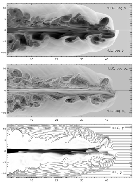 The results are shown in Fig. 12, where we display density logarithm (upper panel), magnetic pressure (middle panel) and Lorentz factor distributions (lower panel). In each panel, the upper and lower halves show the solutions obtained with the HLLC and HLL solvers, respectively. As we already pointed out in the non magnetic case (Paper I), the HLLC integration features considerably less amount numerical diffusion as evident from the richness in small scale structures, notably in the density distribution. In fact, density is the physical quantity more sensitive to the introduction of the tangential wave in the Riemann solver. Comparing our results with those of (Leismann et al., 2005, see their Fig. 5) we can observe that our solution has a similar (or even larger) richness in fine structure details at half the resolution (20 ppb in our case, 40 ppb in their case).