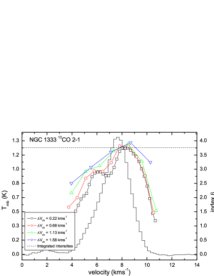 When increasing the channel width by binning, the self-absorption dip is smoothed out, so that the resulting index spectra peak again close to the peak velocity of the line temperature. In all situations where the self absorption is negligible, the indices for the line core channels are almost independent from the channel width. The indices for the line integrated intensities always fall slightly below the peak indices, as they represent an average which is typically dominated by the line cores.