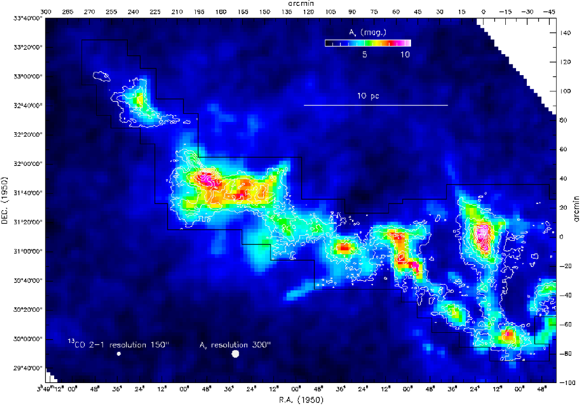 Figure 2 shows an overlay of integrated 13CO 2–1 intensities and a map of optical extinctions (Goodman, 2004; Alves et al., 2005), at and resolution, respectively. The 13CO map covers all regions above 7 mag and % of the regions above 3 mag. A linear least squares fit to a plot of Av vs. 13CO 2–1 results in a correlation coefficient of 0.76. The region mapped in 13CO has a mass of 1.7 104 M⊙ using the data and the canonical conversion factor [H2]/[] = 9.36 1020 cm-2 mag-1 (Bohlin et al., 1978).