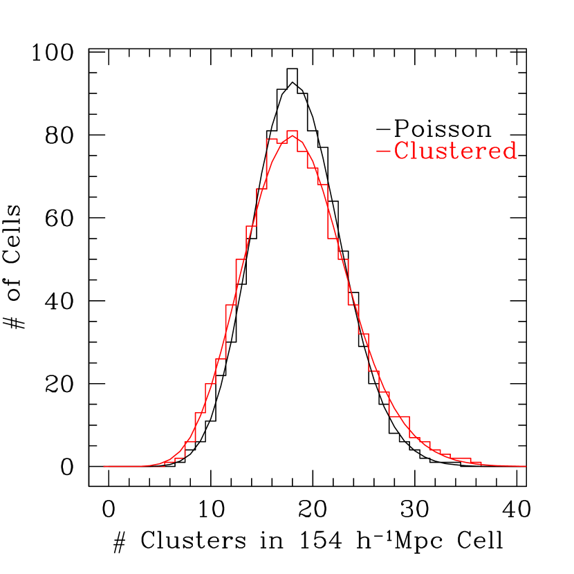The preliminary (and very highly idealized) tests outlined above demonstrate that many cluster surveys can be considered to be in the regime where catalog likelihood methods will be readily applicable. Tests on counts in cells at indicate that the non-Gaussianity of the cluster distribution becomes important around masses of several times . Applications of the cluster catalog likelihood (eqn 2) will likely have similar problems at lower masses and may also have difficulties at small separations. This is a topic of ongoing investigation.