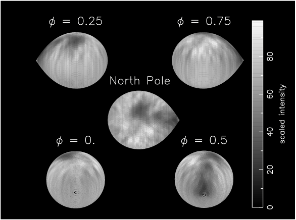 To check whether or not the features seen in the Roche tomogram are real, or spurious artefacts due to noise, we have carried out two further Roche tomography constructions using only the odd-numbered spectra for one and the even-numbered spectra for the other (see Fig. 13). Despite the reduction in phase-sampling, both of these Roche tomograms show the same features as seen in Fig. 10 and therefore we are confident that these features are real. Furthermore, when we construct separate maps for each nights data (not shown here for reasons outlined below), we again find that that features are reconstructed at similar locations in the maps where there is sufficient phase overlap in the observations. This gives us further confidence in the reality of the reconstructed features.