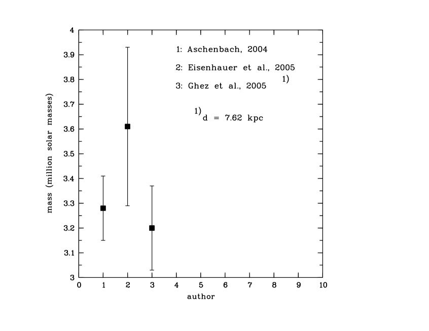 Because of the appearence of a 3:1 resonance I have associated the highest of the three frequencies with the vertical epicyclic frequency and the lowest of the three frequencies with the radial epicyclic frequency, and I assume that the appearence of these frequencies is due to the new effect of General Relativity described above. In this way the spin and the orbit radius are fixed and the mass of the black hole is set by the observed frequencies. For the numerical relation between mass and frequency one may take either the vertical or the radial frequency. Determined in this way it turns out that the mass of the Sgr A∗ black hole is 106 times the mass of our sun. I stress that this mass estimate follows from a straight inverse relation between mass and frequency and does not depend on any other observables like the distance to the black hole. Fig. 5 shows a comparison with the most recent estimates of the Sgr A∗ mass which has been derived from more than a decade long dynamical measurements of the orbits of the S-stars around Sgr A∗ (Eisenhauer et al. 2005, Ghez et al. 2005). These results depend on the distance to Sgr A∗, and the respective data shown are normalized to the same best estimate of the distance of 7.62 kpc (Eisenhauer et al. 2005). The agreement is more than satisfactory and there is the chance to lower the uncertainty for the QPO measured mass significantly by improving the frequency measurements.