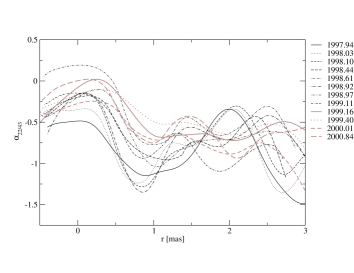 The time evolution of the spectral index of the VLBI core and the inner 3 mas of the jet can be seen in Fig. 5. Shown are the ridge-line profiles of BL Lac across the spectral index VLBI maps between 22 GHz and 43 GHz along P.A. . The spectral index maps were produced by aligning the two images on the brightest component. To reduce the effect of a potential core shift between the two frequencies, we convolved the images with a 0.7 mas circular beam. Since there are no strong spectral gradients visible in the core region that would indicate a core shift, we assume that the effect is negligible at the resolution of our images. The core spectrum in Fig. 5 is significantly flatter than the jet for most of the time especially when it is flaring (e.g., epoch 1998.61). It therefore seems reasonable that the variability of the single-dish radio spectral index is a good tracer for the variations in the VLBI core.
