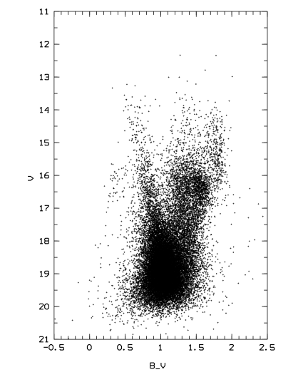 Daophot II (Stetson 1987) was used to extract the instrumental magnitudes. For calibrations we used Landolt (1983, 1992) standard stars. The calibration equations are: = 26.46 + 0.01 () + ; = 26.40 + 0.1 () + ; = 24.61 - 0.01 () + , for 10 sec. and 15 sec. respectively, at 1.25 airmasses. Zero point errors are dominated by the transfer from aperture to Daophot PSF fitting magnitudes and CCD shutter time uncertainties. Atmospheric extinction errors are smaller since AL3 and standards were observed at comparable airmasses. Transfer errors arise from noise in the stellar profile growth curve due to crowding (1 star per 70 pixels). This contaminates stellar wings even for the brightest and relatively isolated stars. We investigate 3 methods: (i) Statistical reconstruction of the growth curve in small radius bins for the best 100 stars per band. (ii) Analysis of a few relatively isolated bright stars subtracting contaminating stars (CS) with the PSF. (iii) Growth curve analysis using models (Diego 1985). Method (i) gives the smallest errors (0.02 to 0.03 mag.), while in method (ii) subtraction residuals increase noise in the star wings. This is caused by possible underestimates of the sky around the CSs or to PSF deviations for faint stars and steeper profiles. Method (ii) should be free of statistical errors. It agrees with method (iii) within a few hundredths of mag. for Lorentzian profiles. Gaussian profiles show 5The CCD shutter time uncertainties (0.3 sec) related to short exposures done for standard stars, lead to an additional 3% error, which is propagated to the calibrations of the long exposure cluster frames. The final magnitude zero point uncertainty is estimated to be 0.05 mag. The atmospheric extinction was corrected with the La Silla standard coefficients.