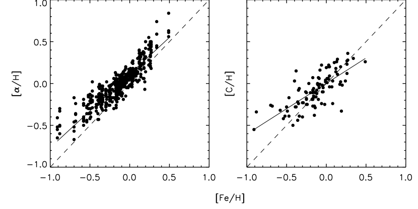 First, we assumed [Fe/H] = [M/H], as we also did for the solar-similar primaries. Then we calculated relationships between alpha element and carbon abundances and [Fe/H] using the abundance data of Allende Prieto et al. (2004). For the alpha elements, we combined the elemental abundances of O, Mg, Si, Ca, and Ti into a single data set. Ti is not strictly an alpha element, but the observed trend of its abundance with [Fe/H] closely matched the other elements in the range of values covered so we included it. We fit these elemental abundances with a single parameter, [/H], as a linear function of [Fe/H]. The expression found was