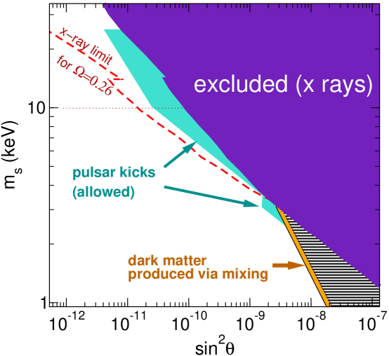 Since this is a two-body decay, the photon energy is half the mass of the sterile neutrino. The monochromatic line from dark matter decays can, in principle, be observed by x-ray telescopes. No such observation has been reported, and some important limits have been derived on the allowed masses and mixing angles. These constraints are based on different astrophysical objects, from Virgo and Coma clusters, to Large Magellanic Clouds, to Milky Way halo and its components[27]. There are different uncertainties in modeling the dark matter populations in these objects. Different groups have also used very different methods in deriving these bounds: from a conservative assumption that the dark-matter line should not exceed the signal, to more ambitious approaches that involved modeling the signal or merely fitting it with a smooth curve and requiring that the line-shaped addition not affect the quality of the fit. In any case, the limits apply to the flux of x rays, which can be translated into the limits on mass and mixing angle if the sterile neutrino abundance is known. As we discussed above, the production is possible via the mixing alone, but some additional couplings and other production mechanisms are by no means excluded[20]. Most published bounds[27] assume that sterile neutrinos make up all the dark matter, that is . The limit based on this assumption is shown as a dashed (red) line in Fig. 1. However, it should not be used as the exclusion limit for sterile neutrinos in general, because it is possible that , while the sterile neutrinos could still explain the pulsar velocities and they could play a role in the star formation.