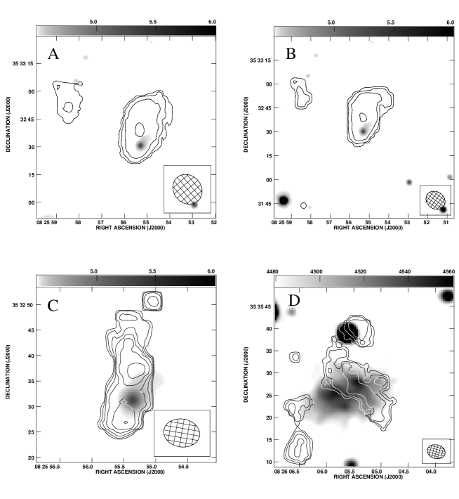 In Fig. 4 we show overlays of the SDSS -band (Abazajian et al., 2005) optical emission and the H i emission from HS 0822+3542 and SAO 0822+3545. The H i extension to the north-east of HS 0822+3545 seen in Fig. 1 can also be seen in Fig. 4[A] & [B], although at these resolutions the emission does not connect to the main body. This could be a consequence of both the marginal signal-to-noise ratio as well as the lower sensitivity to diffuse emission in these maps. One can also see a tidal tail like extension from the northern end of HS 0822+3542 (most clearly in panel [B]). The H i emission (apart from these features) is fairly symmetric about its peak. The H i emission is unusually extended compared to the optical emission, but even more unusual is the large offset between the optical emission and the centre of the H i emission. While the H i distribution seems in general uncorrelated with the optical emission, one can see in Fig. 4[C] a kink in the H i contours aligned with the diffuse plume of optical emission extending to the north-west.