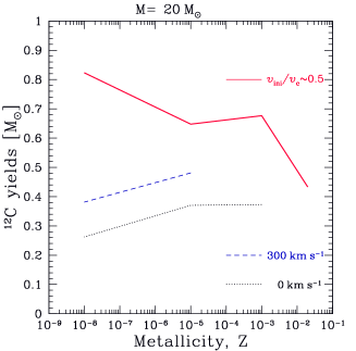 The value of 300 km s-1 as the initial rotation velocity at solar metallicity corresponds to an average velocity of about 220 km s-1 on the Main Sequence (MS) which is very close to the average observed value (see for instance Fukuda, 1982). It is unfortunately not possible to measure the rotational velocity of very low metallicity massive stars since they all died a long time ago. Higher observed ratio of Be to B stars in the Magellanic clouds compared to our Galaxy (Maeder et al., 1999) could point out to the fact the stars rotate faster at lower metallicities. Also a low metallicity star containing the same angular momentum as a solar metallicity star has a higher surface rotation velocity due to its smaller radius (one quarter of radius for 20 stars). Since there is however not yet firm evidence for fast surface rotation velocities at low metallicities, we explore in this work with 20 models different velocities ranging between no rotation and surface velocities corresponding to the same total angular momentum as in solar metallicity stars.