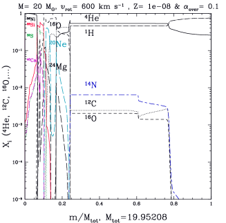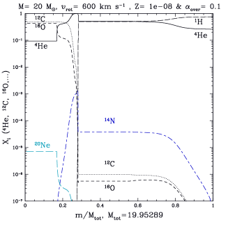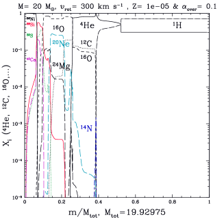 Figure 12 (left) shows the abundance profiles before the shell H–burning boost and Fig. 12 (middle) shows the profiles after. These profiles show that the carbon and oxygen brought to the shell H–burning are transformed into primary nitrogen. The bulk of primary nitrogen is however produced later in the evolution. It happens when the shell H–burning deepens in mass during core helium burning for the very massive models and during shell He–burning for the 20 model. The deepening of the convective H–burning shell is caused by dynamical shear instabilities (see Sect. 2.3 in Hirschi et al., 2004, and references therein). Dynamical shear instabilities take place just below the bottom of the convective zone due to the strong differential rotation between the convective H–burning shell and the layers below (deeper in the star). Dynamical shear instabilities occur on a dynamical time scale as opposed to secular shear and they therefore induce a fast mixing just below the convective zone. Note that the dynamical shear instabilities are not influenced by mean molecular weight gradients. The consequences are the same as during the first boost. Carbon and oxygen are mixed inside the H–burning shell and a new boost occurs, producing this time more nitrogen because the newly mixed material is richer in carbon and oxygen. Figure 12 (right) shows the abundance profiles after the second boost. The abundance of nitrogen does not change later during the advanced stages and the pre–SN profile for nitrogen (see Fig. 13) stays the same. The total production of primary nitrogen is further discussed in Sect. 4. Rotational mixing also influences strongly the mass loss of very massive stars as is discussed below.