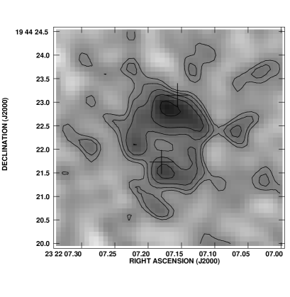 APM0827+5255 (): The presence of extended CO(1–0) emission in APM0827+5255 was reported by Papadopoulus et al. (2001). Additional CO(2–1) C–array imaging by Papadopoulus et al. also showed some evidence for an extended envelope around the central QSO. We have have obtained new C and B array observations for this source and do not find evidence for such an extended CO component. In Fig. 4, we show our highest resolution data, where we detect a compact but resolved structure of the lens images. Two clearly separated images can be seen, and their morphology and brightess ratio is very similar to that of the optical QSO. We thus conclude that the CO in this source is indeed extremely compact, and that the lensing magnification is close to the optical magnification i.e., a factor of 100 rather than 7 as derived in previous models (Lewis et al. 2002). Further evidence against an extended CO(1–0) reservoir around APM0827+5255 comes from our multi–CO transition study of this source (Weiss et al. 2006, in prep., see also this volume, and recent single dish observations of this source using the GBT, Riechers et al. 2006, see also this volume).