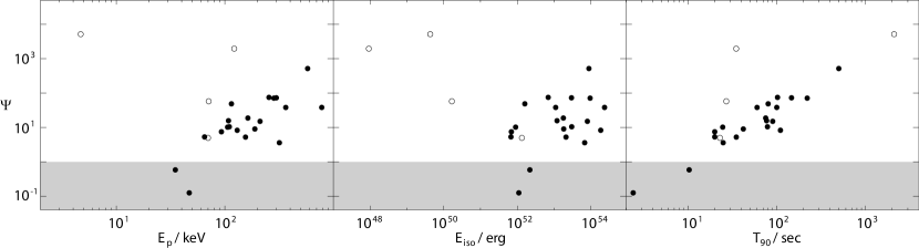In order to compare the limit imposed by Eq.Β 7 with observations, we use the following observational properties derived by Ghirlanda et al. (2004) and Kaneko et al. (2006): , and . In Fig.Β 1 we show the distribution of as a function of , and . Filled circles are typical long bursts from the sample compiled by Ghirlanda et al. (2004), while the empty circles are the four long GRBs found so far to be spectroscopically associated with type Ic supernovae (Kaneko et al., 2006). Of the latter, three have a smooth, single peak temporal profile (while GRBΒ 030329 has two peaks). Only two bursts have while most bursts (and in particular those associated spectroscopically with supernovae) have . Fig.Β 2 shows the maximal value of that is allowed according to Eq.Β 7, .
