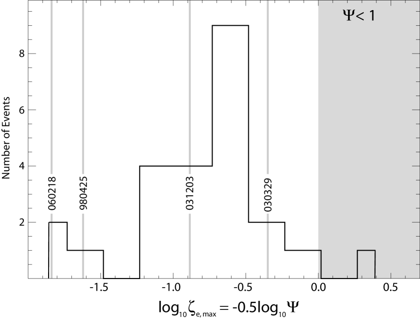 There are some necessary limitations to our approach. The choice of that has been used in the definition of in Eq.Β 7 is conservative. More typical values that are inferred from afterglow modeling ( and ) would result in the values of being smaller by a factor of when compared to . It is also important to note that is used as an estimate for the isotropic equivalent kinetic energy . This would increase the value of by a factor of , where is the -ray efficiency: . However, even for -ray efficiencies as low as , would only increase by a factor of .