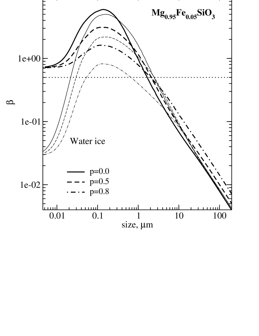 where corresponds to the value of the threshold energy for size . In this regime, decreases with size. Housen & Holsapple (1990) and Ryan & Melosh (1998) present a wide range of values for . We cannot directly apply their result because we are dealing with much smaller sizes. As pointed out in Tielens et al. (1994) “for submicron-sized bodies, cracks play little role, and the strength of a material approaches the ultimate yield strength of the material”, which corresponds to ergs/g (Tielens et al., 1994, and references therein). The threshold energy size-dependence most probably has a knee in the micron-submillimeter size range, but since we do not have any information about the slope change we decided not to introduce two additional unknown parameters into the code, but simply to adopt a slightly shallower slope, , for our calculations.