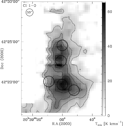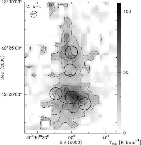 DR21 is associated with molecular gas centered at a velocity of . In addition to this, weaker emission between and is associated with the W75 N complex approximately pc (D/1.7 kpc) to the north-west. Some authors (e.g., Dickel et al. 1978) conclude that both clouds are actually interacting. SBS2006 shows channel maps revealing a link between both clouds. Diffuse emission in the 13CO and both [C i] transitions, and absorption in the red wing of the low- CO lines (up to ) suggest that this material is located in front of the DR21 complex. We do not further discuss this contribution here and refer to SBS2006.