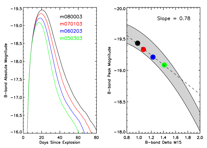 Figure 23 shows that the slope of the WLR for this model set is steeper than observed. The slight positive correlation between and is due to the dependence of the spectroscopic/color evolution on , as discussed in Kasen & Woosley (2006) and § 5 above. However, three other effects act counter to this in the moderately mixed models: