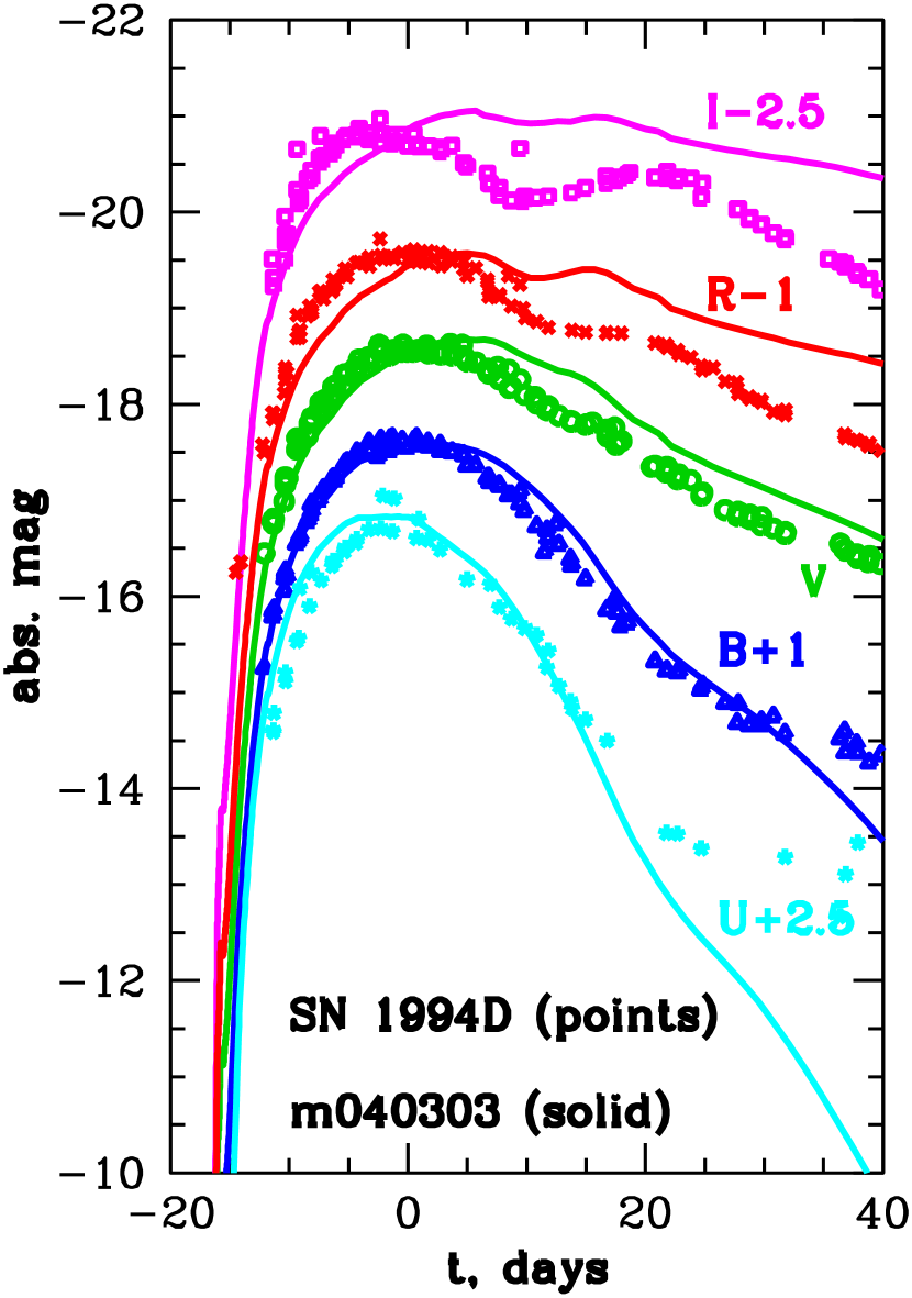 Fig. 9 compares synthetic light curves of Model M040303, computed by stella, to observations of the Type Ia SN 1994D (Richmond et al., 1995; Meikle et al., 1996). The agreement is especially good in , and in general it is not worse than for the MPA deflagration models presented by Blinnikov et al. (2006). Comparison with sedona results for the same model in Fig. 3 suggests that the agreement with observations in and filters can be improved by extending the line list used in stella for computing expansion opacity.