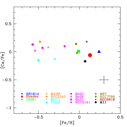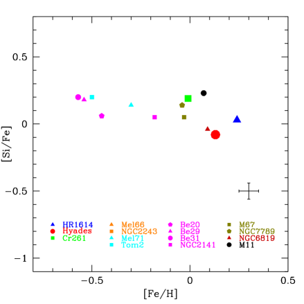 consistent pattern observed in old open clusters (see Table 7 of F03). This is a sign of a rapid enrichment history, which is to be expected at the early stages of disk formation. Since the age of Cr 261 is comparable to the age of the disk, it is likely to have formed shortly after the disk began to form, therefore its chemical evolution must have been relatively quick. C05 find that Ba, which is thought to be produced predominantly in AGB stars (although a smaller r-process component may be produced from Type II SN (Pagel & Tautvaisiene, 1997)), is also enhanced in Cr 261. The number of studies on the heavier n-capture elements is few for old open clusters. Work on other n-capture elements would be helpful in exploring the enrichment history of these elements.