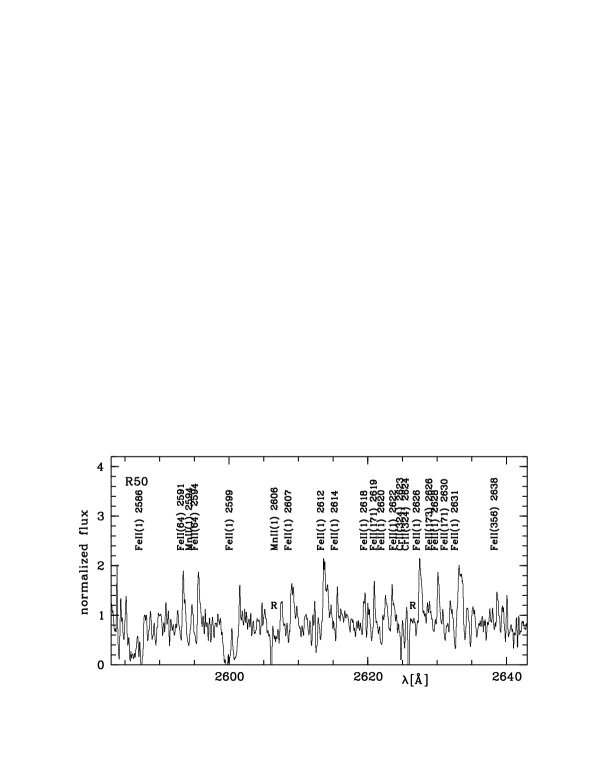Inspection of the spectra shows that they exhibit common properties, like e.g. narrow absorption features of singly ionized metals, in particular of Fe ii. However, there are also individual characteristics which differ from one object to the other. Whereas in the spectrum of R 82 the emission components are absent or only weak with the exception of Mg ii, R 50, and also Hen S22, exhibit much stronger emission components of the P Cygni profiles. The absorption components of R 50 on the other hand are considerable weaker than in the two other stars, even for the Fe ii of multiplet 1. This may partly be due to a combination of a low wind velocity and the resolution of the IUE spectra. The difference between R 50 and R 82 is surprising because in the visual wavelength region both stars exhibit very similar spectra (Muratorio 1981, Zickgraf et al. 1986). A comparison of the spectra of R 82 and Hen S22 with those of LBVs reveals certain similarities. This is especially evident in the case of R 82. The IUE UV spectrum of this star strongly resembles the spectrum of S Dor observed during outburst phase (cf. Leitherer et al. 1985).