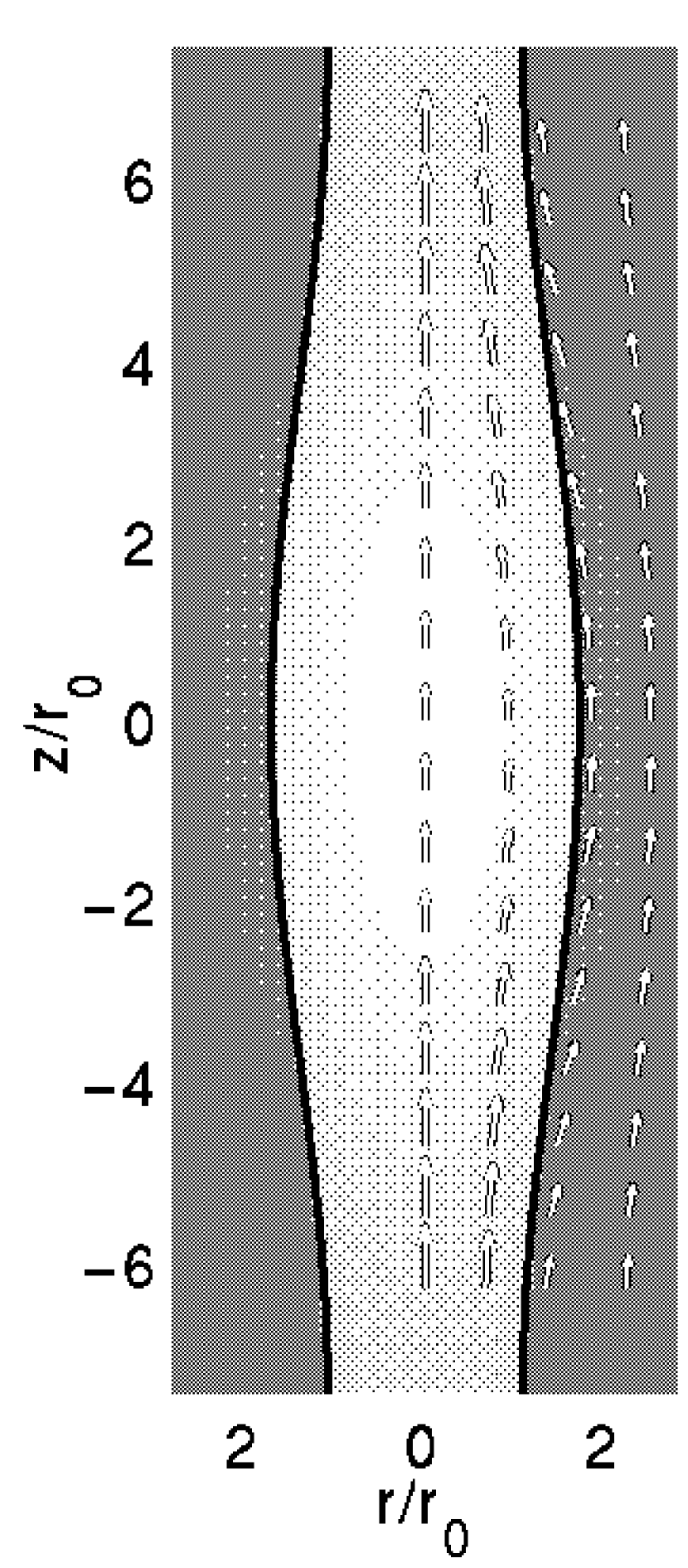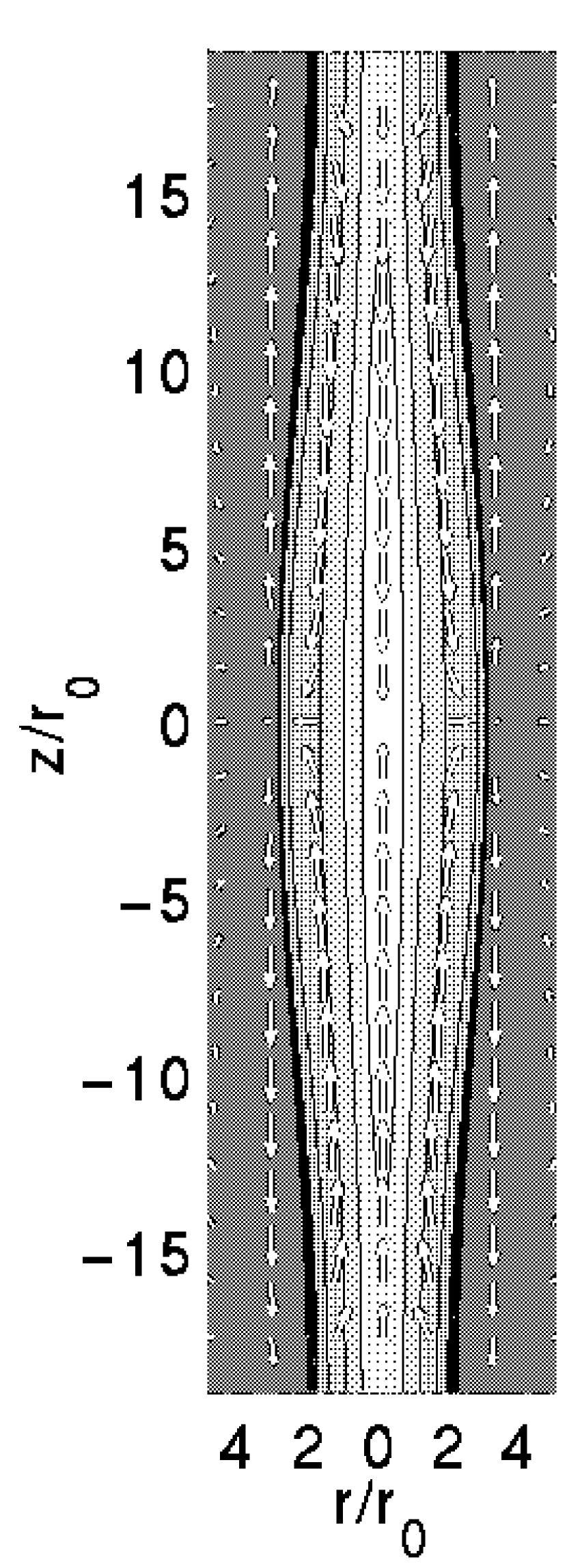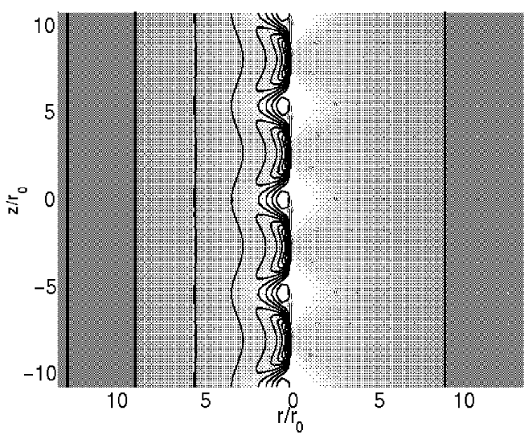 Two examples of eigenmodes are shown in figures 3 and 4 for unmagnetized filaments; the first shows the fragmentation of the untruncated Ostriker solution, while the second is significantly truncated (). These figures show a single wavelength in the periodic fragmentation of a filament. We note that the size of the perturbation is greatly exaggerated in these figures, where we typically add a perturbation of (in peak density) to the unperturbed solution.