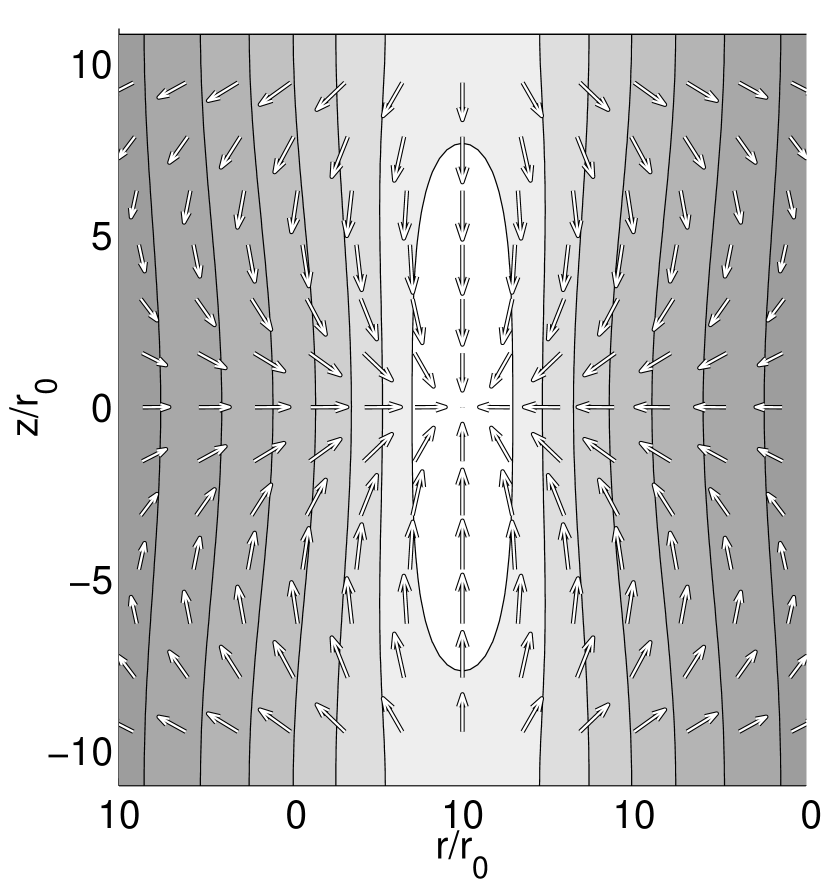The arrows in figures 3 and 4 show the velocity field, but the scaling is logarithmic due to the large range of velocities that must be shown. Specifically, , where we choose . Both cases have purely poloidal velocity fields. The untruncated case shows an asymmetric infall onto the fragment, with almost purely radial infall near the fragments, and some radially outward motions between them. On the other hand, the truncated model shows infall along the axis, but the motions are actually radially outward in the vicinity of the fragment. This is due simply to the outward bulging of the fragment, which can occur because there is no infalling material approaching from the radial direction.