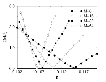 We conclude our analysis of critical behaviour on the Nishimori line with the results: and . Our value for is consistent with the result , obtained by Honecker, Picco and Pujol,[27] who carried out a detailed study of the interfacial tension and correlation functions, using the Ising model transfer matrix in a spin basis, which restricted system widths to . Our value for is also in agreement with some earlier, less precise values, including , in Ref.[23] and in Ref.[26], both found using a transfer matrix approach with up to 14 spins. It is also marginally in agreement with from Ref.[29] obtained as the critical disorder strength around . It is in marginal disagreement with the result from series expansions,[18] . More strikingly, however, our value for is in disagreement with previous estimates, which lie close[18] to the percolation value, , including most recently in Ref.[27]. We believe that the larger system sizes accessible in our work, and the allowance we have made for irrelevant scaling variables at the critical point, together account for the discrepancy, and that the data shown in Figs.β15 and 18 exclude this smaller value of .