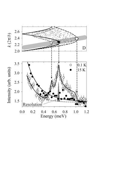 The -dependence of the low-energy dispersion is illustrated in Fig.Β 3(5), which plots the oscillation in the minimum energy position vs. and . Data points were extracted form fits to the low- to medium-energy part (0.10.4 meV) of the dispersion along for various βs. The observed incommensurate oscillation is well explained by Eq.Β (2), for which at a given the minimum energy occurs at (solid line).