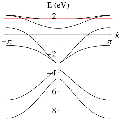 We first diagonalize the quadratic, noninteracting portion of the Hamiltonian to obtain the band structure of the Cu-O ladder. The band structure is shown in Fig. 2. Evident in Fig. 2 is the fact that only two bands cross the Fermi level so we can analyze both ladders (with and without extra oxygens) in a similar manner. Note, however, that for very different tight-binding parameters different numbers of bands may intersect the Fermi level. In the two band case, it can be easily shown that at half filling, where is a Fermi momentum defined by and is chemical potential. However, since there is no particle-hole symmetry, the Fermi velocity at the two Fermi points differs even at half filling: .