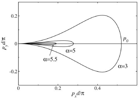 In Fig. 9, the solution of the energy conservation condition for 1D optical lattice is shown in a plane. As predicted in Sec. V.2, one finds that the curve of the solution shrinks as increases and vanishes when , which indicates the disappearance of the Beliaev damping for .