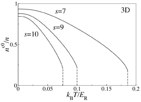 where is the usual dimensionless parameter describing the optical lattice depth in units of the photon recoil energy . is the dimension of the optical lattice and is the lattice period. We only consider simple cubic lattices considered in recent experiments Esslinger1 ; Greiner . We call attention to the recent technique Esslinger2 of producing a two-dimensional array of long, tightly confined condensate tubes by loading a Bose condensate into a deep 2D optical lattice potential, which prevents atoms from hopping between different tubes. With an additional 1D optical lattice potential along a tube, an ideal 1D system can be experimentally realized Esslinger2 . One can also have an ideal 2D system by loading a condensate into a deep 1D optical lattice and a shallow 2D optical lattice. We assume this experimental setup for the realization of 1D and 2D optical lattices in the present paper. We also assume that the laser intensity determining the depth of the optical lattice wells is large enough to make the atomic wave functions well localized on the individual sites (i.e., where we can use the tight-binding approximation). The energy gap between the first and the second excitation bands is large compared to the thermal energy (), and thus only the first band is thermally occupied.