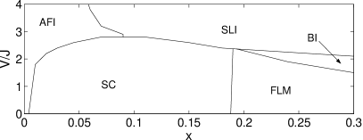 The zero temperature mean-field phase diagram is determined upon minimizing the mean-field energy , where and is the number of lattice sites. Motivated by the mutual exclusion of antiferromagnetism and superconductivity BL0373 in the cuprates, we omit the possible coexistence of antiferromagnetic and superconducting orders. The resulting phase diagram for the bilayer model is depicted in Fig. 1. It comprises five distinct regions whose properties we discuss below: