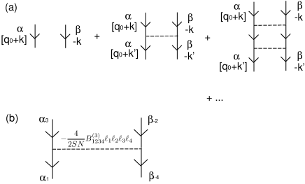 In the first order in , the magnon energy is changed into due to the Oguchi correction. Therefore, is modified by replacing and in Eq. (39) with and , respectively. Let be the function after this modification. Within the same order, we have to take account of the magnon-magnon interaction. Only the terms of a factor in Eq. (27) is relevant to the present calculation. Consider the ladder approximation shown in Fig. 3 for the two-magnon Green’s function. Regarding the dependence on k and in as a matrix with dimensions, we notice that the sum of the ladder diagrams is equivalent to the expression,