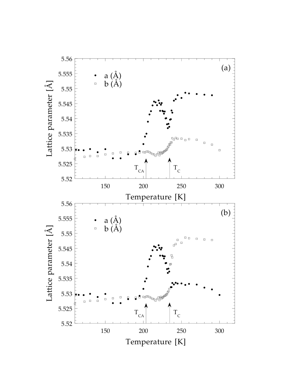 FIG. 4 Temperature dependence of the and lattice parameters showing the strong reaction of the lattice at and . and are very different above (the system is in the orthorhombic O′ phase), then the ferromagnetism drastically suppresses the static lattice distortion and and become almost equal at , but next the precursor effects of the phase transition at distort the lattice once more, before releasing the lattice distortion almost completely below . Due to the uncertainty in identifying and from single-crystal diffraction on a twinned sample, the situation described in (b) may be realized, where there is a crossover between and at .