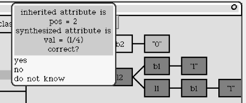 The user starts slice-based debugger pointing it an incorrect attribute value in the attributed parse tree. The slice-based debugger systematically locates the source of the problem in the attribution rules. The debugger computes the slice for the incorrect attribute and partition the slice into two subslices. Then the debugger queries if incorrect attribute values are passed from one subslice to another. This is accomplished by asking separate questions for these attribute values, respectively. In Fig. 8, Aki is asking about correctness of the value of one of those attributes. Given answers to these questions, the debugger narrows the search space for erroneous code into one of the subslices and eventually locate the incorrect attribution rule.