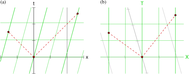 If we move along a space-like curve with and , we return to the same event where we started after or . This is a result of the periodic nature of the coordinate or . We can now apply Eqs. (10)–(11) to investigate how the primed coordinates of change along the same integration path:
