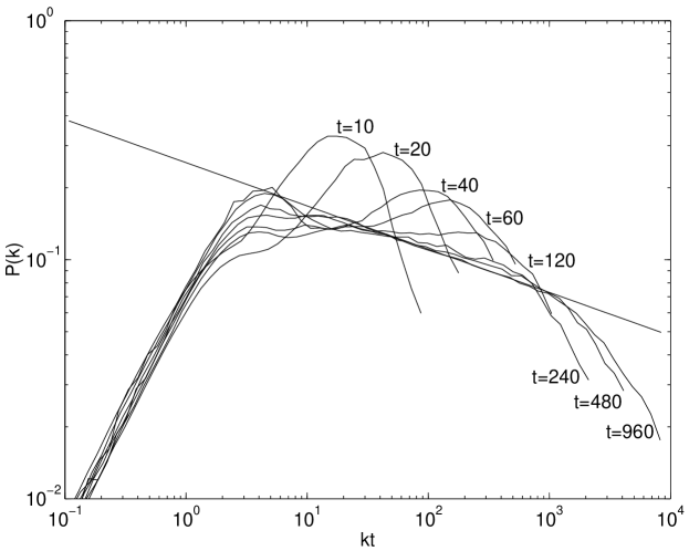 to demonstrate that all spectral lines cluster along some universal power spectrum. This demonstrates that the power spectrum at late times is a function of alone, just like we would expect for a scaling network. The slowly declining part of the spectrum has a small power law dependence, which is presumably a result of processes such as loop emission near cusps. The best fit power law is