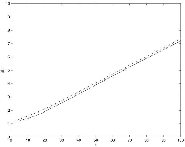 Thus it appears that, at late times, the typical string distance is only about 1/10 of the elapsed time since the start of the simulation (here called ). Since our initial conditions had inter-string distance about 1, they correspond to an initial setting of the natural time parameter about 10.