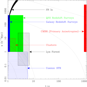 Fig.1 summarises the different observations of cosmological significance and the range of length scales and redshift ranges probed by them. The broken (thin) lines in the figure are contours of from bottom to top. Clearly, the regions where corresponds to those in which nonlinear effects of structure formation is important. Most of the astrophysical observations — large scale surveys of galaxies, clusters and quasars, observations of intergalactic medium (Ly- forest), star formation rate (SFR), supernova (SN Ia) data etc. — are confined to while CMBR allows probing the universe around . Combining these allows one to use the long “lever arm” of 3 decades in redshift and thus constrain the parameters describing the universe effectively.