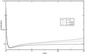 In figure 5 we plot the acceleration versus time; the results show that an initial period of deceleration is followed by an accelerated era. The extension of each period is related to the combination of parameters , , and the quotient between the initial energy densities. The results show that there is a critical value of (around 0.3) that implies in a fast growing of the acceleration. On the other hand, as it was expected, a larger quotient gives an earlier transition to the accelerated regime, indicating that the dark energy starts dominating the cosmological fluid, opening an era of eternal accelerated expansion. This behavior is qualitatively similar to the 4D case[7, 5].