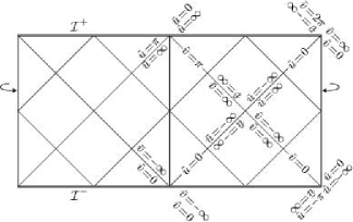Clearly, we can imagine the spacetime as the time evolution of a 3-sphere which shrinks from infinite extension at to a radius , and then expands again in a time-symmetric way. Hence, we also call the spherical cosmological coordinates. The coordinate lines are shown in the conformal diagram, Fig. 2.