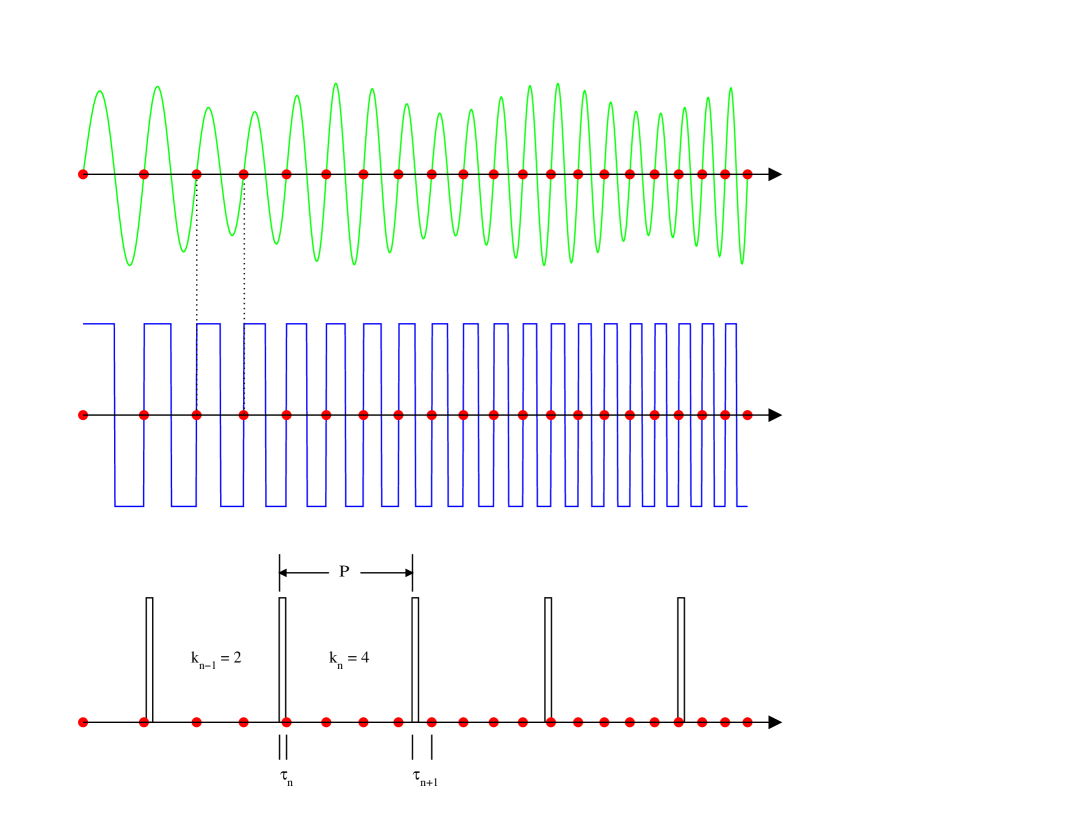 The zero-crossing phasemeter which we utilize measures phase by timing between the zero-crossings of the input signal and a fiducial clock. We condition the signal by amplification and clipping to help identify the zero-crossings. If we neglect any noise in the signal and assume a perfect phasemeter, then if the signal and clock frequencies are the same, the times measured should be constant. This represents a constant phase difference between the signal and the clock. Typically the signal frequency is orders of magnitude higher than the sampling frequency. Figure 1 illustrates our timing scheme.