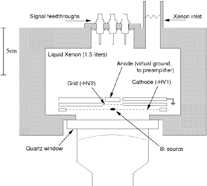 The LXe is excited by the 570 and 1064 keV ’s (and their associated internal conversion electrons and X-rays) emitted by a 207Bi source. The source is prepared as a monoatomic layer electro-plated on a m diameter carbon fiber that is then threaded through the cathode grid. The thin source minimizes the effects of self-shadowing of the scintillation light and is essential to obtain acceptable scintillation resolution. The data presented here were collected at drift fields of 0.2kV/cm, 0.5kV/cm, 1kV/cm, 2kV/cm, and 4kV/cm.