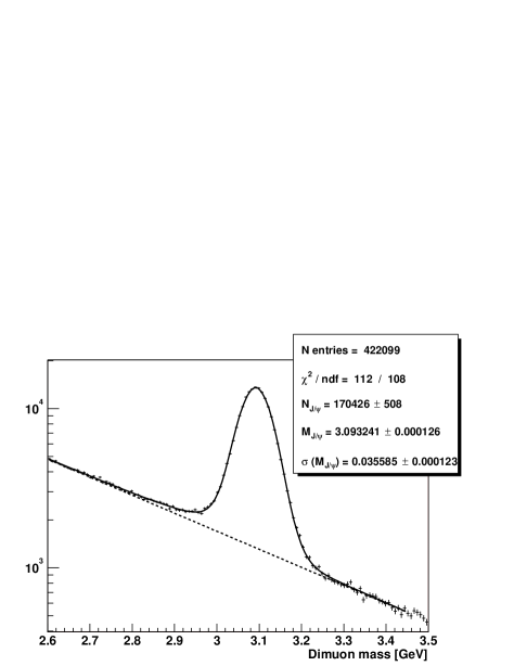 In the HERA-B detector, a forward spectrometer with non-negligible amount of material on the path through the magnet [8], Molière scattering is essential [7] for the momentum resolution. Therefore in the fitting function (23) instead of one Gaussian we used a symmetric function composed of three Gaussians to take into account the details of the momentum (mass) resolution in the HERA-B detector. The fit of the dimuon mass spectrum by this symmetric function accompanied by an exponential function for the background resulted in = 338 for 108 degrees of freedom as presented in fig.14a).