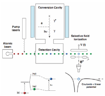 An experimental setup utilizing this technique called CARRACK has been assembled in Kyoto, Japan Cavity_review ; Kyoto_1 and a schematic can be seen pictured in figure 11. The axion conversion cavity is coupled to a second “detection” cavity tuned to the same resonant frequency . A laser excites an atomic beam (in this case rubidium) into a Rydberg state () which then traverses the detection cavity. The spacing between the energy levels is adjusted to using the Stark effect and microwave photons from the cavity can be efficiently absorbed by the atoms (one photon per atom, ). The atomic beam then exits the cavity and is subjected to selective field ionization in which electrons from atoms in the higher energy state () get just enough energy to be stripped off and detected Physics_Today .