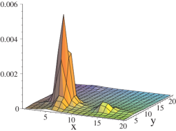 In Fig. 12 we show -slices of the scalar density for configuration 32 (in the plots we again label these two axes as and ). The slices were taken through the maxima of the two peaks, i.e. at = 5,8 (left column of plots), respectively at = 15,15 (right column of plots). We use values of showing the two extremal situations where only one of the lumps dominates (, top) and , bottom) and an intermediate situation (, middle). Note the different scale for the two columns of plots. The data we show are from the run with the boundary phase attached in 1-direction. The plots show clearly that the zero-mode changes its location with . The same pattern with certain values of where a single lump dominates and intermediate values with an advancing and a retreating lump is also seen for the other configurations which visit two or three lumps. Equivalent plots taken for the zero-modes computed with boundary conditions in 2-direction show similar behavior. The lumps sit at the same positions and even have similar shape, such as e.g. the slightly elongated form along the -axis in the plots in the left columns.