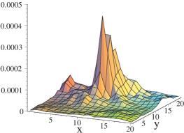 Note that since our eigenvectors are normalized one has where the sum runs over all lattice points . From the analytic continuum result as well as from lattice studies it is known that the zero-mode traces the underlying instanton. Plots of the density for slices of the lattice will be used below to illustrate the behavior of the eigenmodes. We will also compare the position of the lumps seen by different eigenmodes by computing the euclidean 4-distance between their maxima