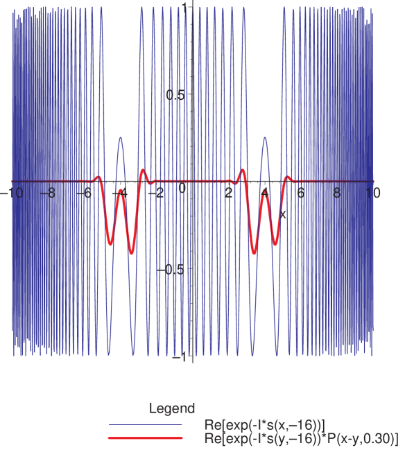The graphs below show the behavior of the partition function. In the leftmost one, the oscillatory behavior can be clearly seen and, in the rightmost one, the same behavior is shown (for a fixed , in blue/dark grey) together with the mollified version of the partition function (in red).