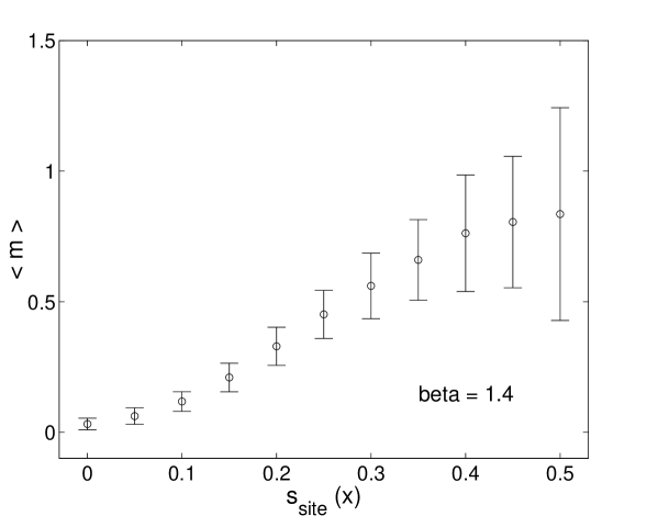 Apart from obvious changes in the scale of the action density, generically the same dependence occurs for in the deconfinement phase. For instance, the range of the distribution of the local action values varies with . In contrast to this, there are practically no lattice points with topological density , irrespective of . A physically relevant feature in Fig. 6 is the increase of the average local density of monopole currents at small action density or topological density . For somewhat larger values of and , respectively, the mean local monopole density seems to reach a plateau of one monopole current on the average. The increase of the error bars with or reflects the insufficient statistics of lattice points with larger action or topological density.
