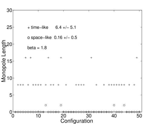 Finally, in Fig. 12 the total length of monopole loops is shown, separated into the time-like and space-like part, for each individual lattice field configuration at and , respectively. In the confinement phase space-like monopole currents dominate over time-like although there exists, at finite temperature, already some anisotropy (the ratio is smaller than ). We find large clusters of monopole currents which percolate through the lattice both in time and in the three space directions. This will be the topic of a separate publication [25]. In the deconfinement phase only monopole-antimonopole pairs remain where each world line wraps around the time direction. In our sample, space-like currents occur exclusively as deformations of these almost static world lines, only in the four configurations mentioned above. This is clearly visible in Fig. 12 and illustrates the direction in which the monopole content of the theory is changed in the deconfinement phase. Nearer to the transition temperature we expect space-like monopole currents to occur more frequently but no space-like percolation should exist above the transition temperature.